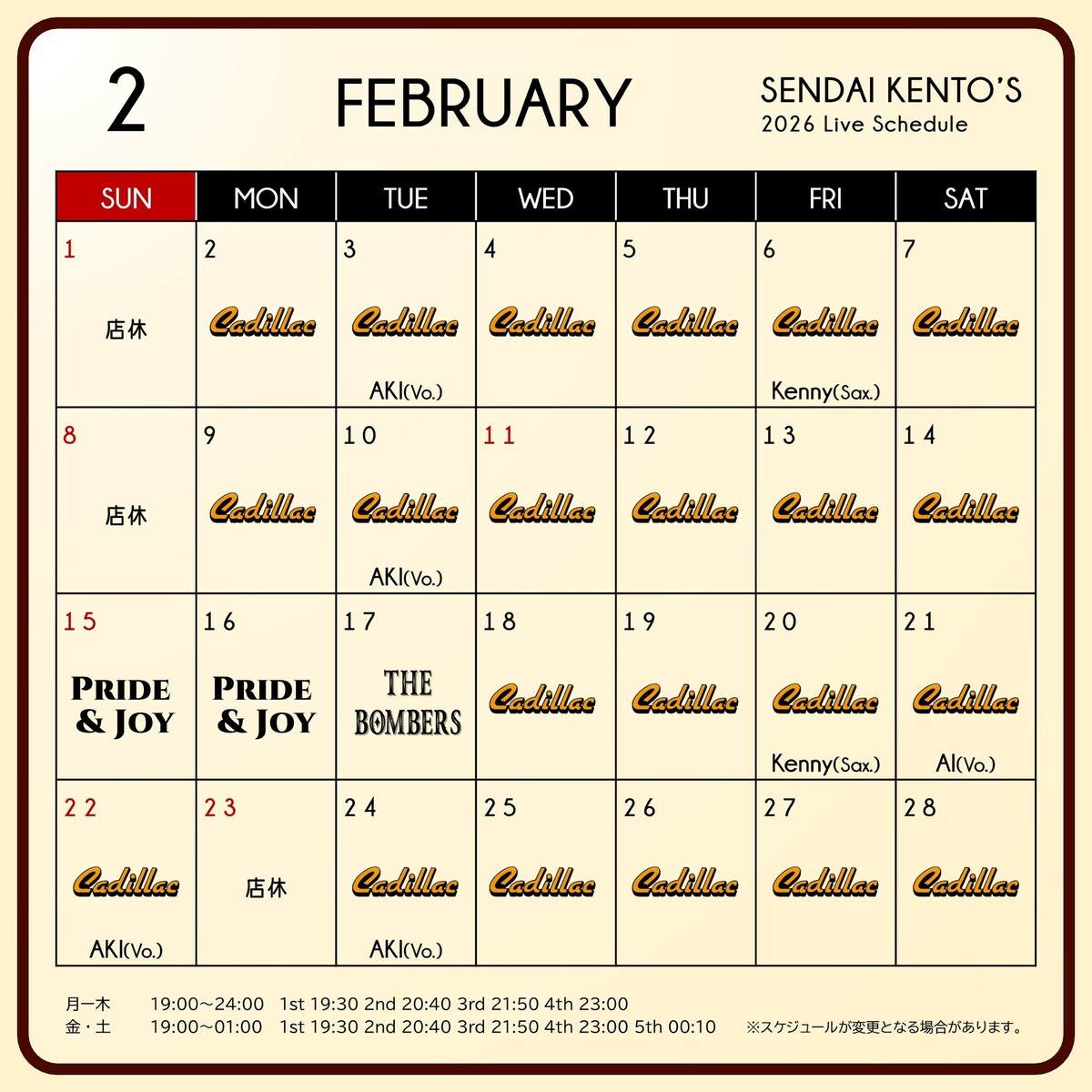🎶仙台ケントス2月ライブスケジュール🎼